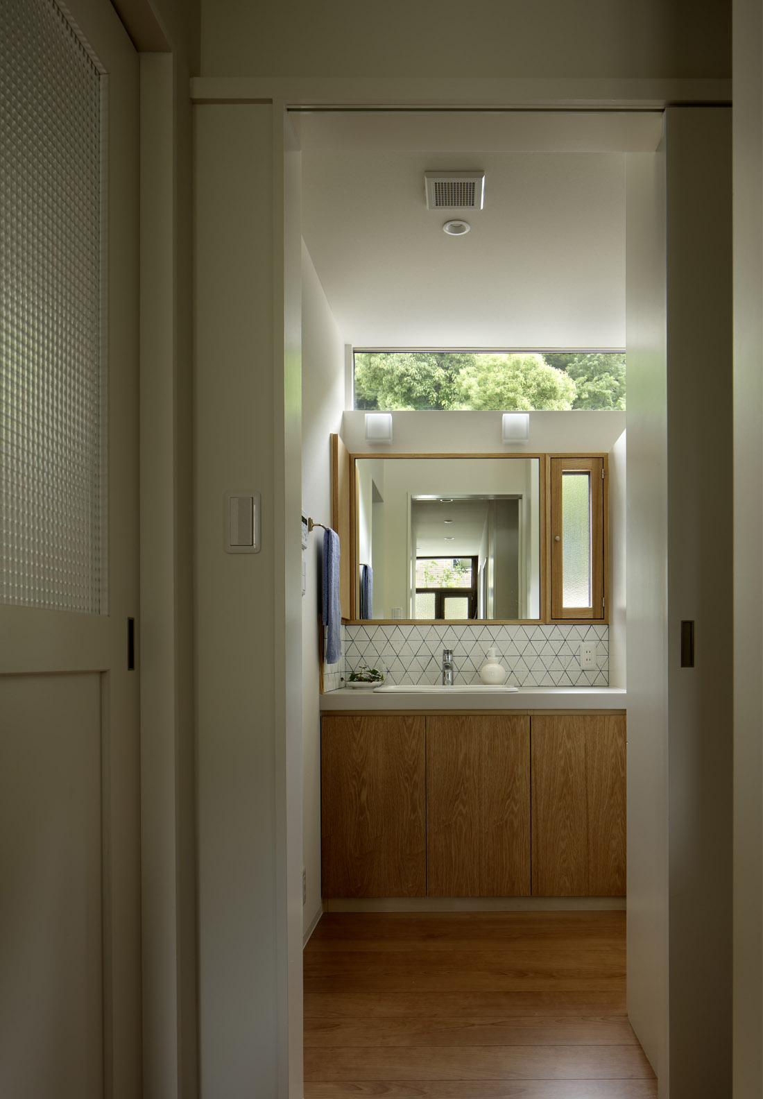 ダイニング、キッチン、リビング、和室がクランクしながら間取りが連なり、それぞれ庭と個性ある繋がり方をしています。室内と庭は木製の窓で切り取るようにして繋がり、それぞれ窓辺に寄り添う居心地の良いコーナーをかたちづくっています。