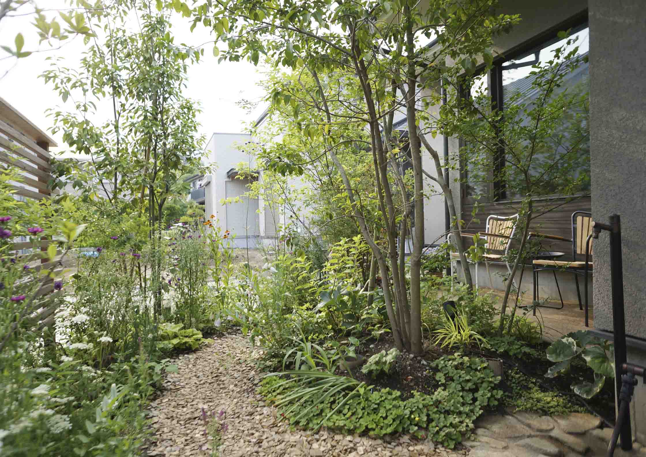 北側の地山の風景にしっくりと溶け込む佇まいとすること、南側の雑木の庭を楽しむ家づくりがテーマとなりました。